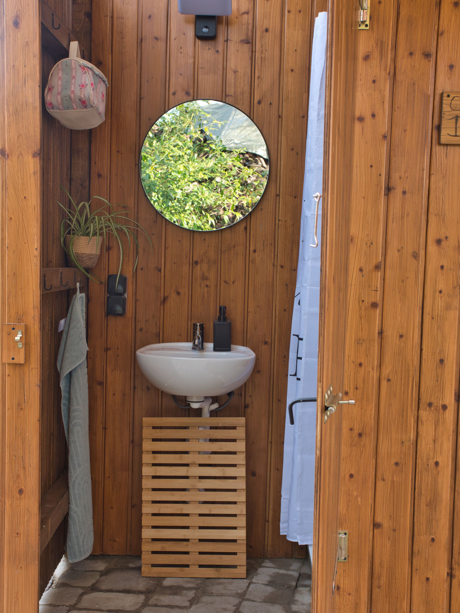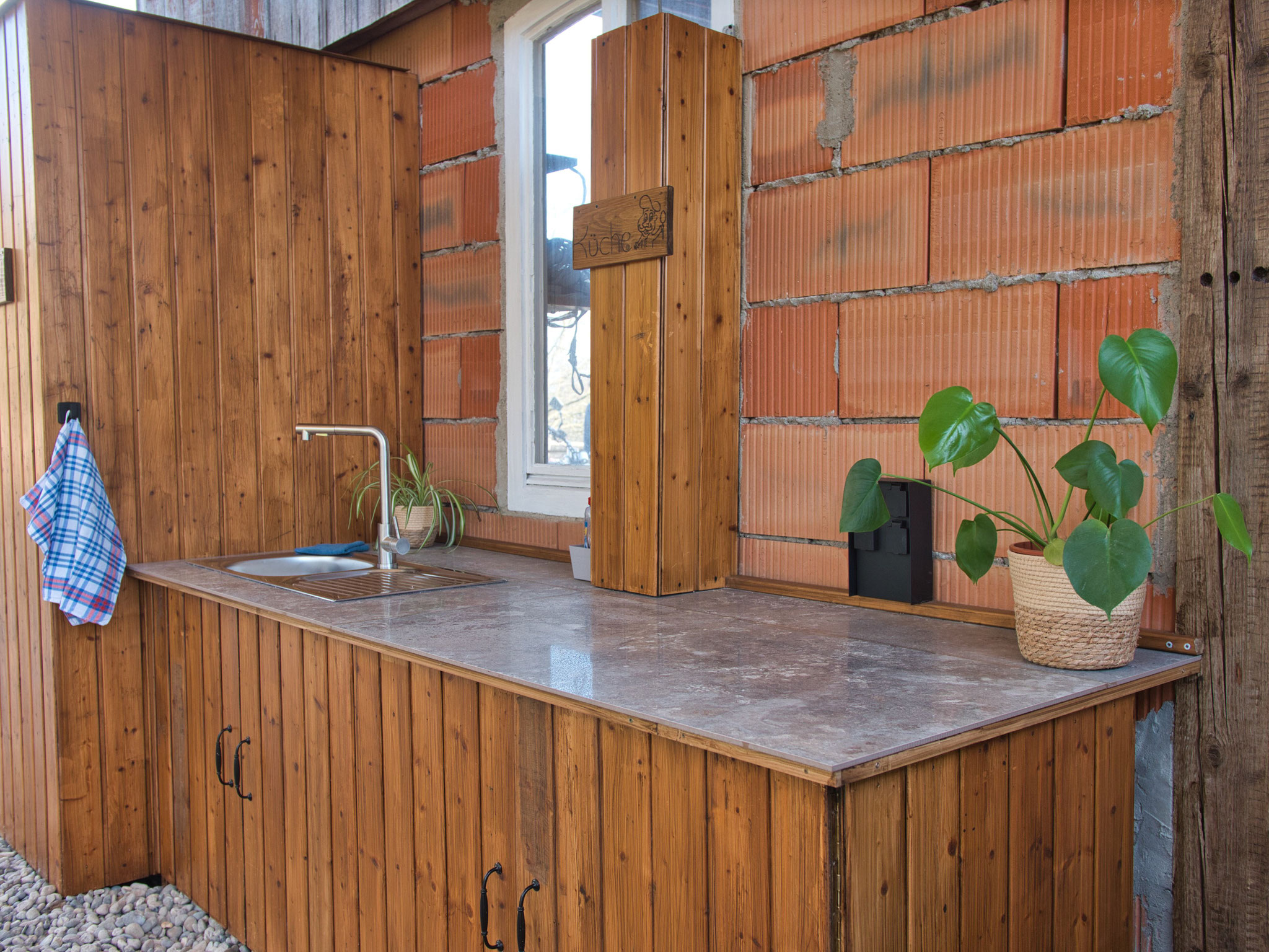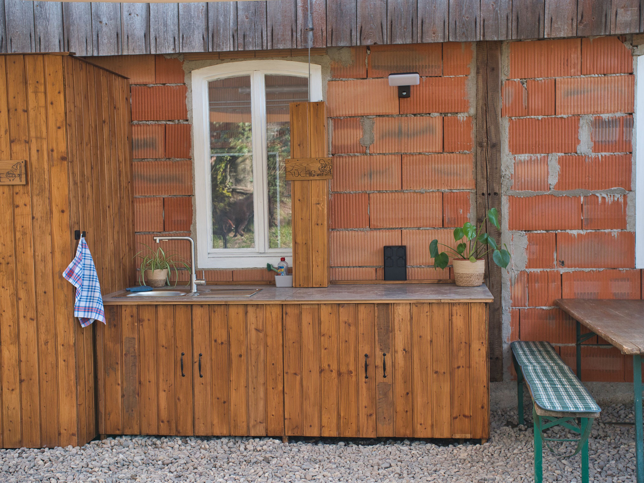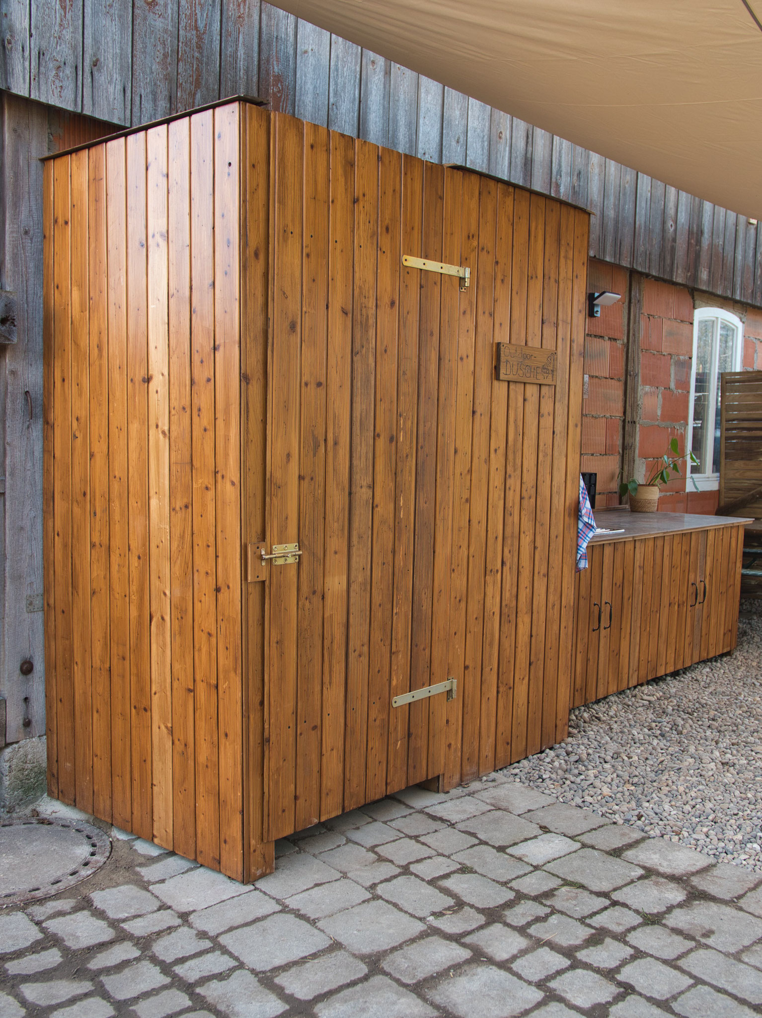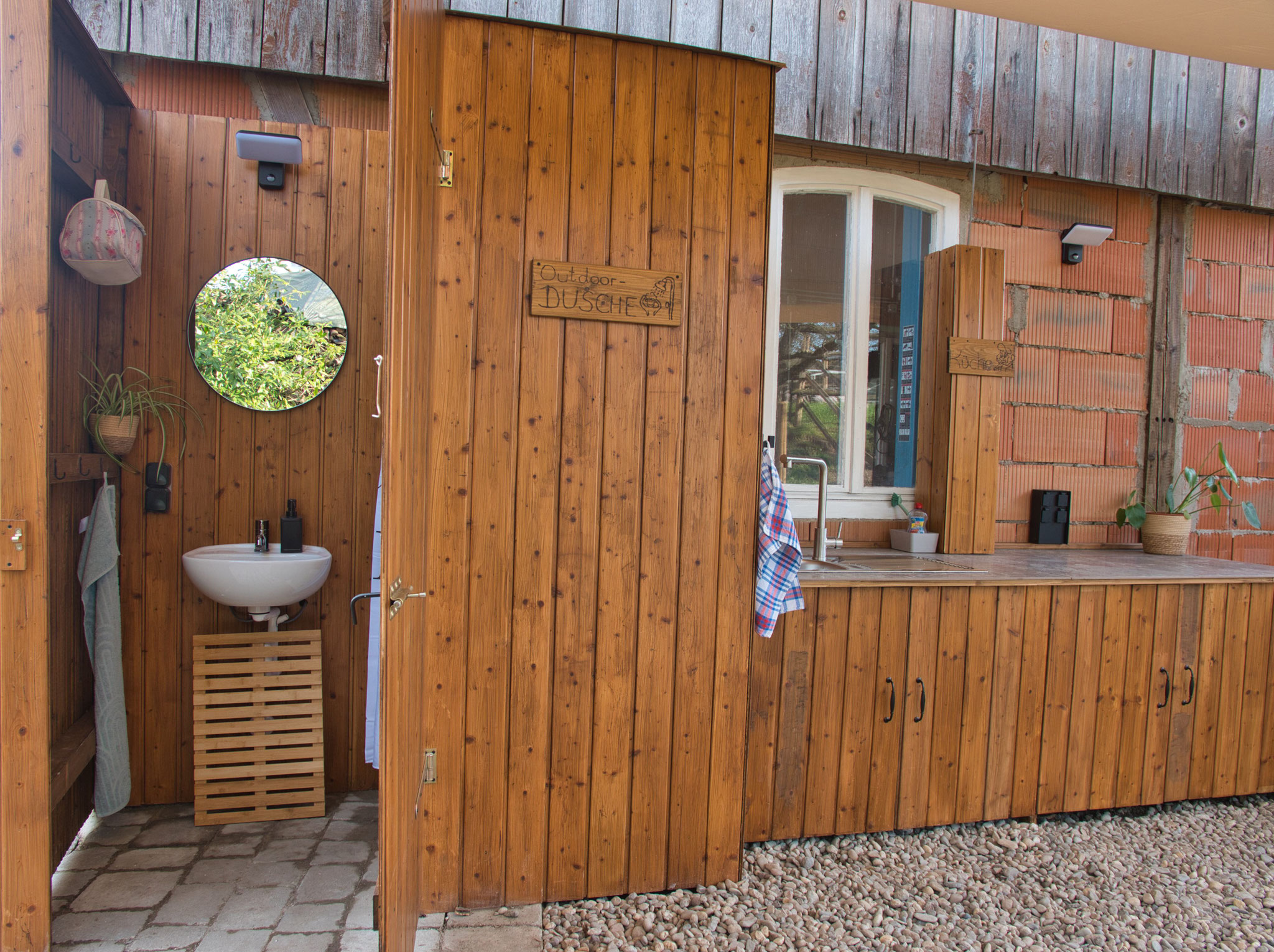 Direkt daneben befindet sich eine Outdoorküche und ein Outdoorbadezimmer mit Dusche und Waschbecken, ebenfalls zur gemeinschaftlichen Nutzung.