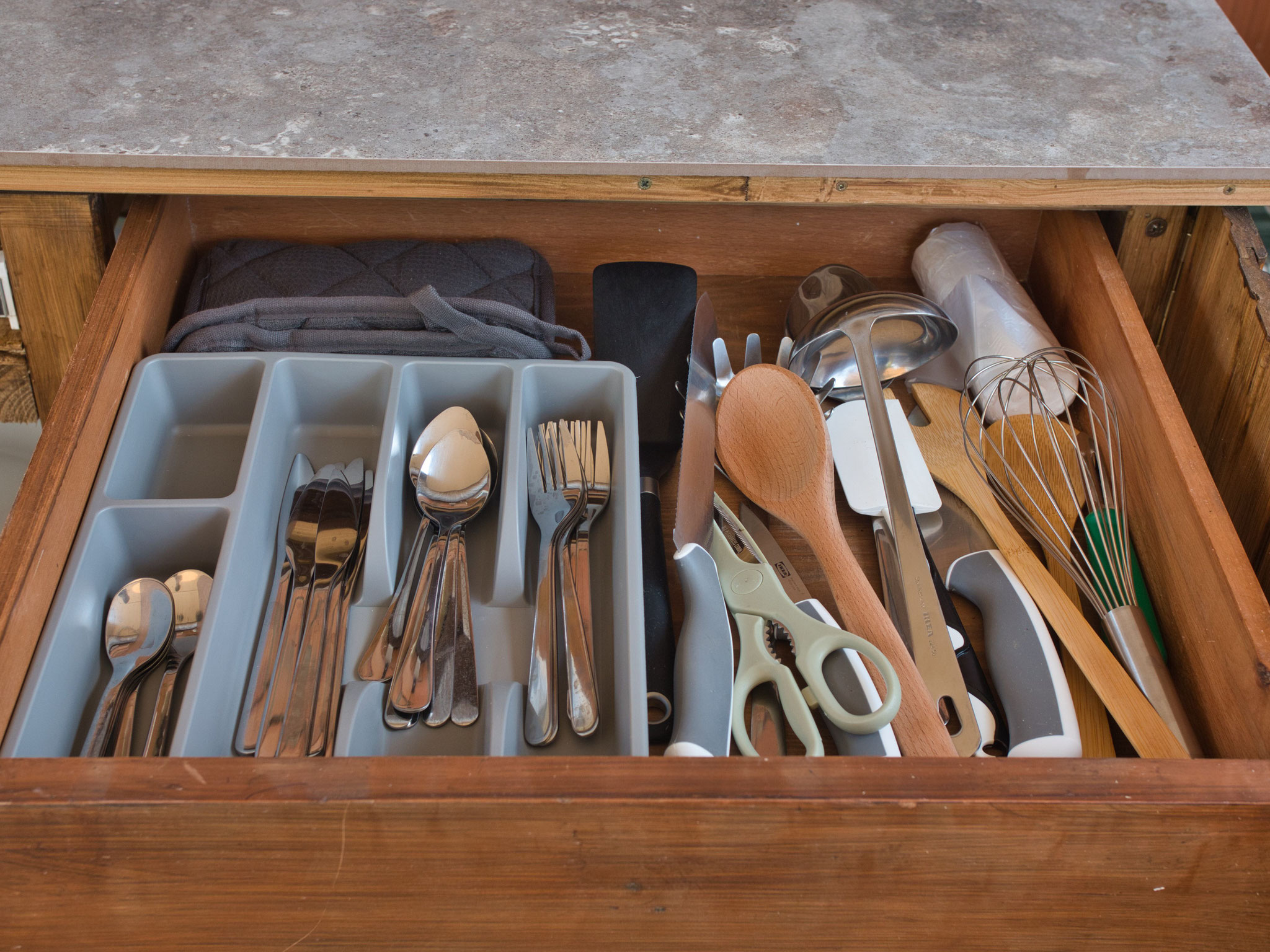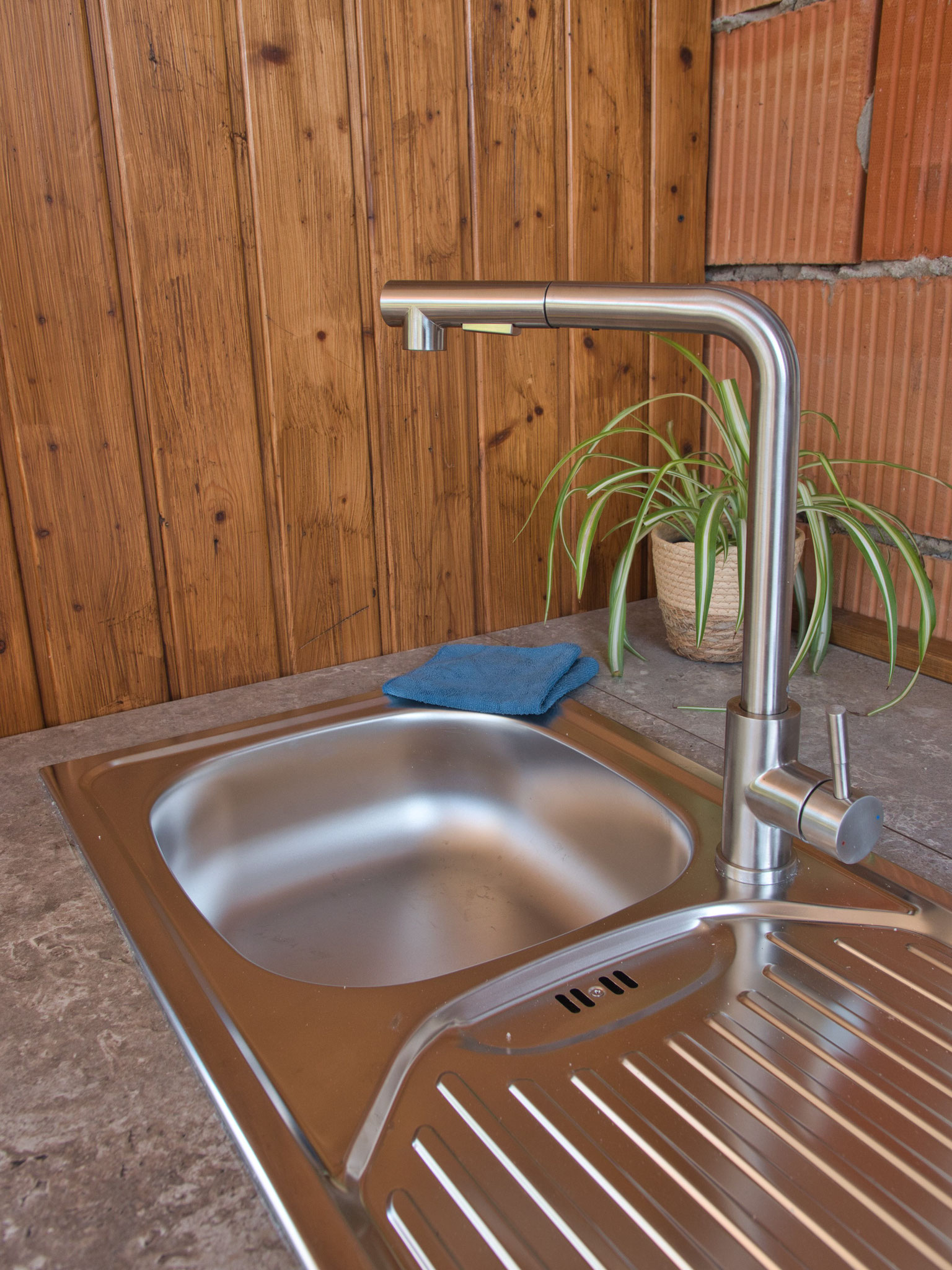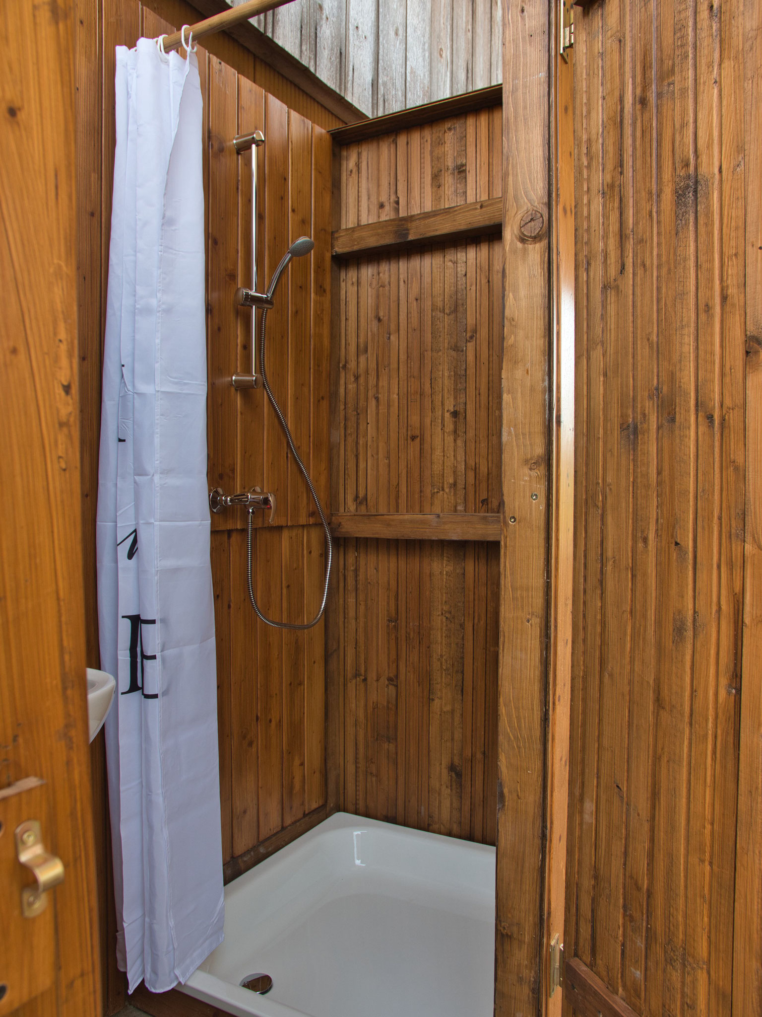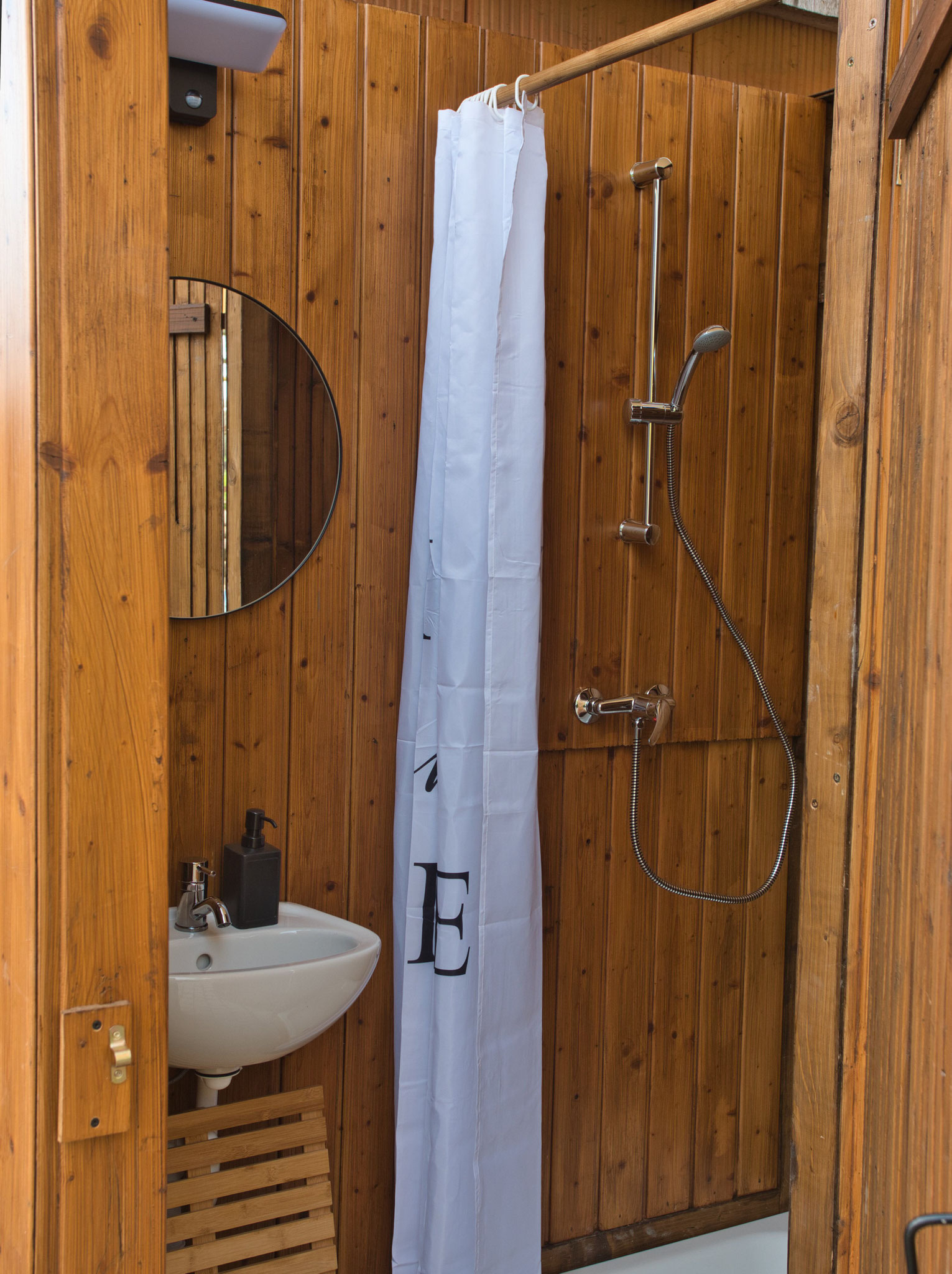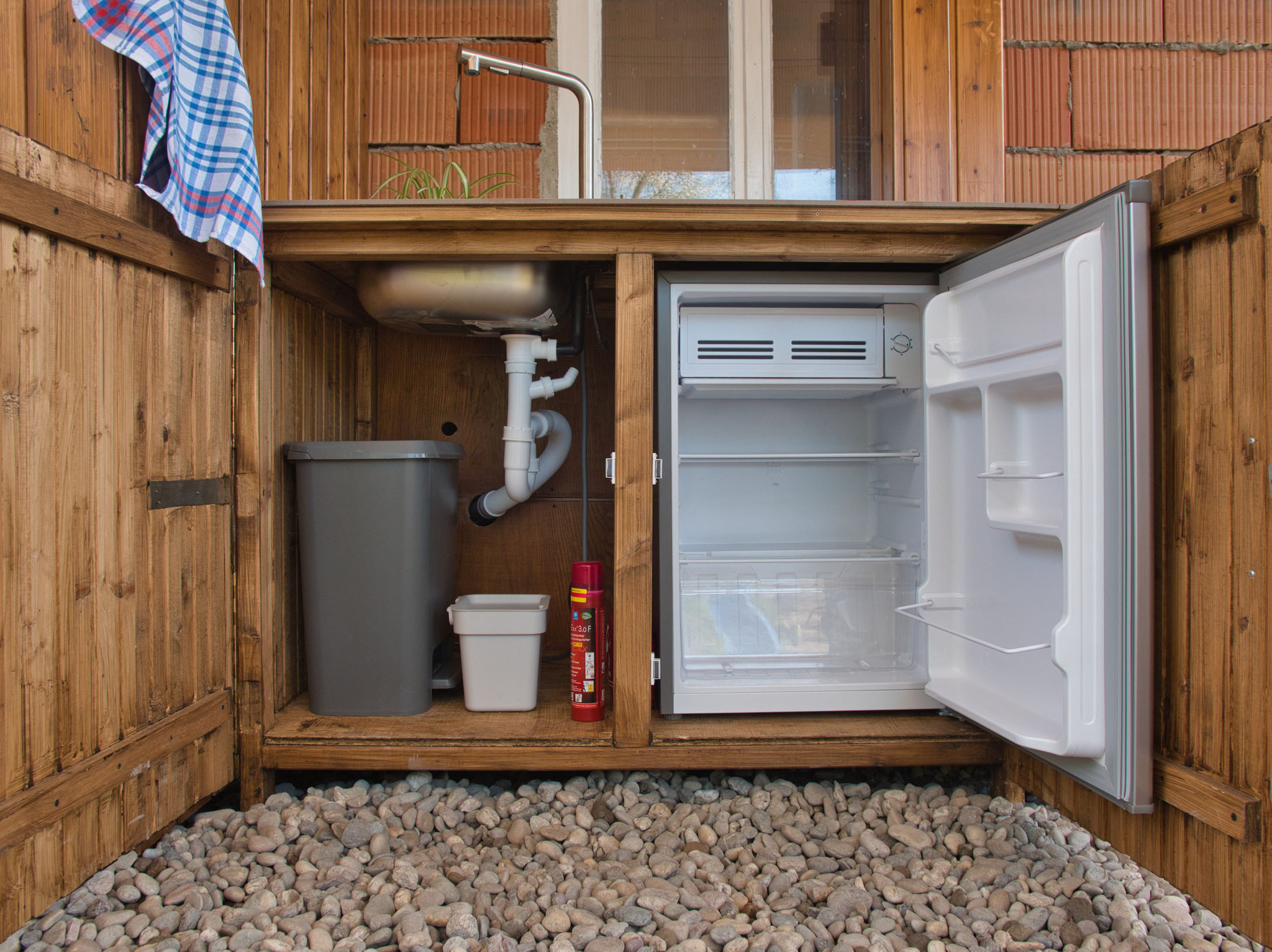 Direkt daneben befindet sich eine Outdoorküche und ein Outdoorbadezimmer mit Dusche und Waschbecken, ebenfalls zur gemeinschaftlichen Nutzung.