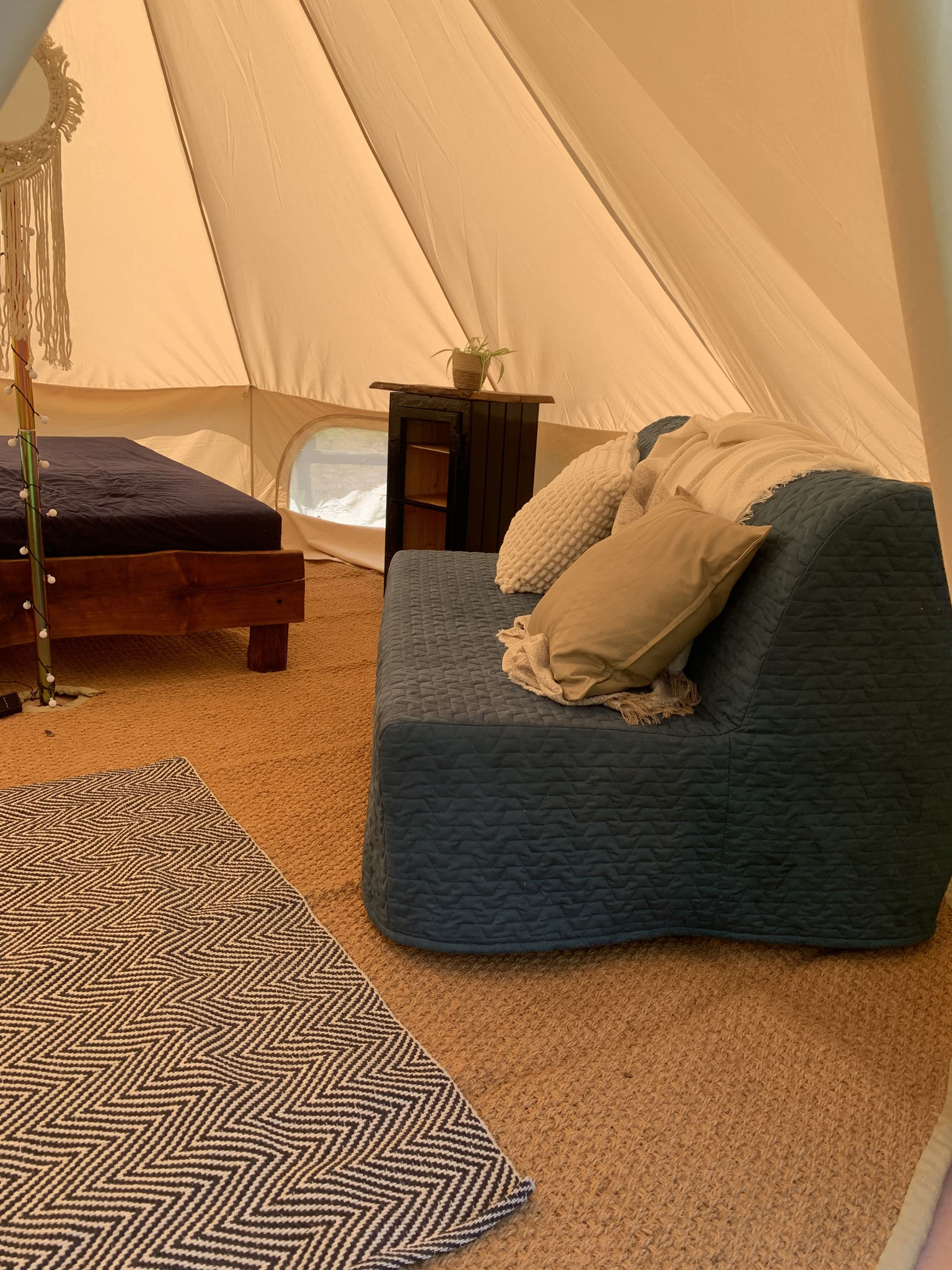 Das gemütliche Tipi bietet Platz für die ganze Familie oder eine Gruppe von Freunden. Es ist mit einem Doppelbett und einem Schlafsofa ausgestattet und bietet somit Schlafplätze für 4 Personen. Zudem ist ein Tisch mit Stühlen vorhanden. Ein WC zur gemeinschaftlichen Nutzung befindet sich in dem Stallgebäude.